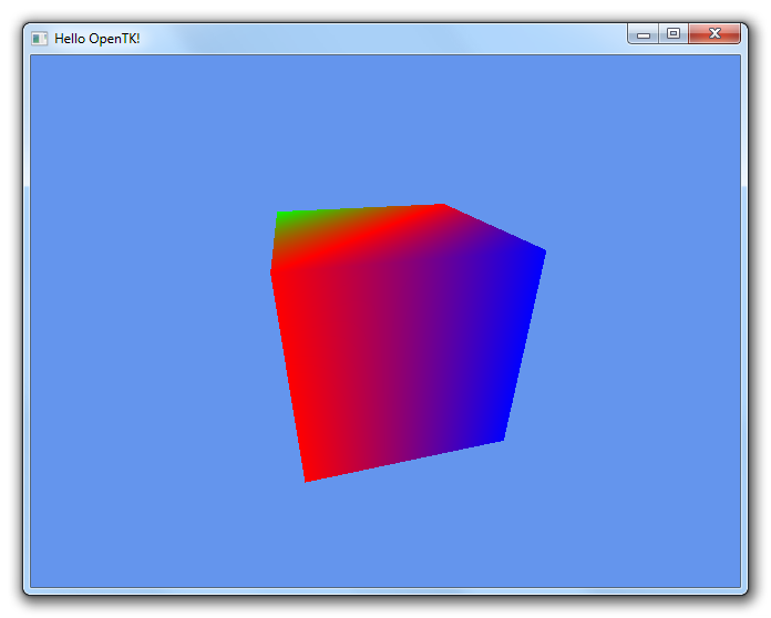A note about this code: here we have two different things being done at once that should really be separated. Right now it’s not that important, but a later tutorial will include making the perspective and view matrices separate from the model matrix (when we have more than one model, we should reuse the other two). Also, if you’ve used OpenGL in the past, you’ll note the order of operations being off here, since in a shader you would have perspective before transformations. OpenTK does it different (matrices are transposed compared to OpenGL), requiring us to switch things around.